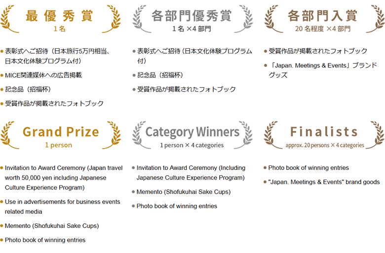 All prize-winning content will be exhibited at the awards ceremony (the exhibited photographs will later be sent to the prize-winners) and posted on the JNTO Meetings & Events official website.